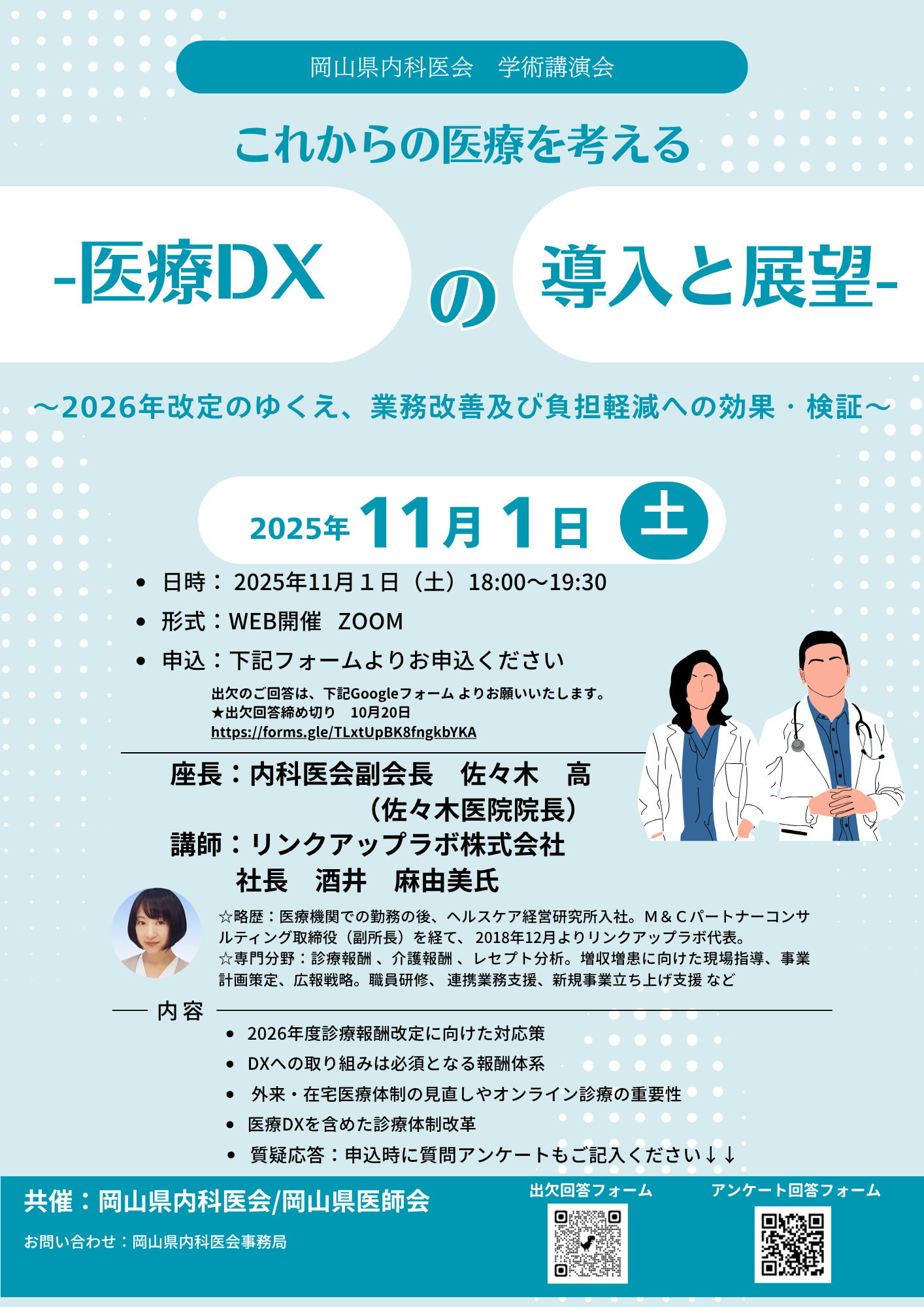 - 研修会の予定に『岡山県内科医会学術講演会 ~HPVワクチン接種勧奨再開を迎えて~』を掲載しました。